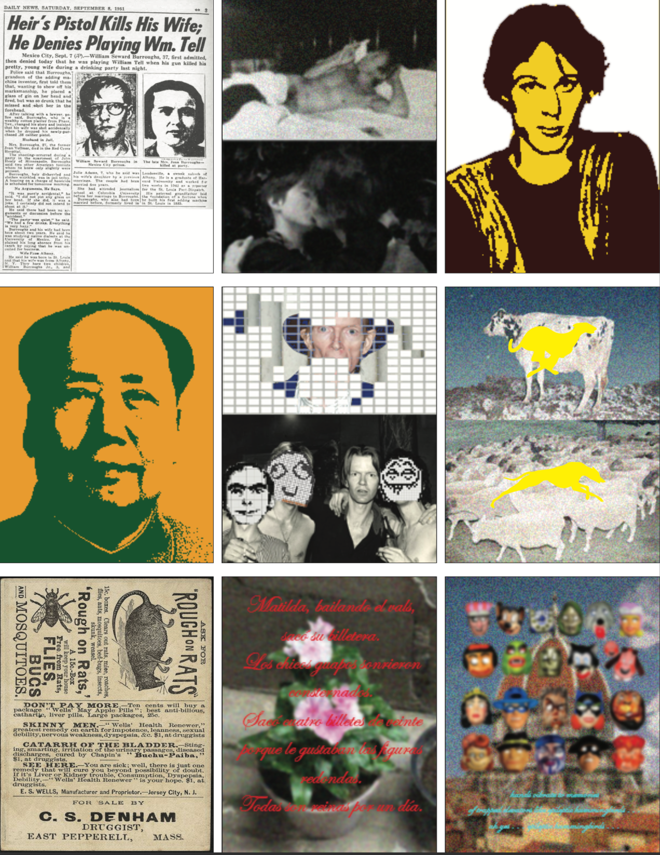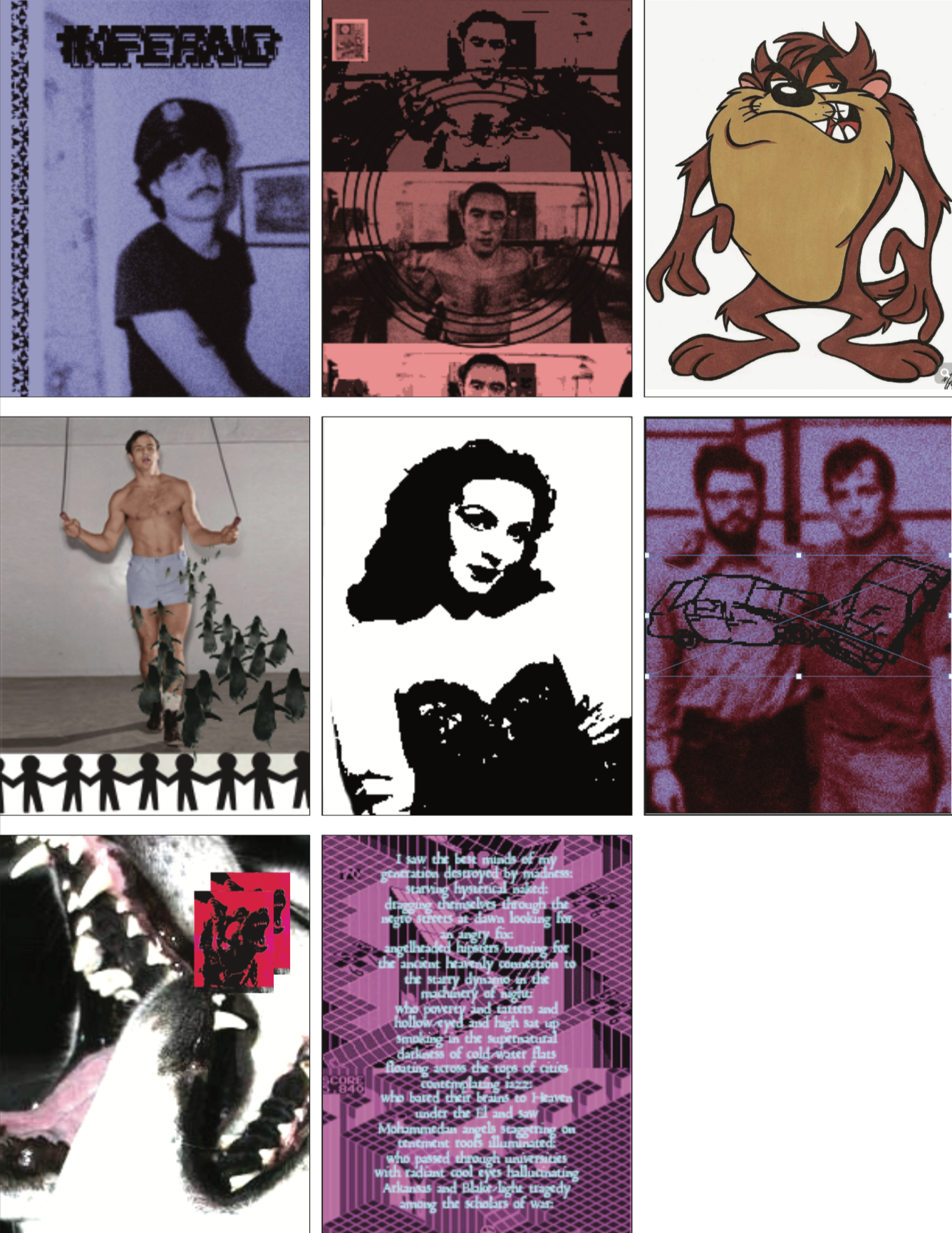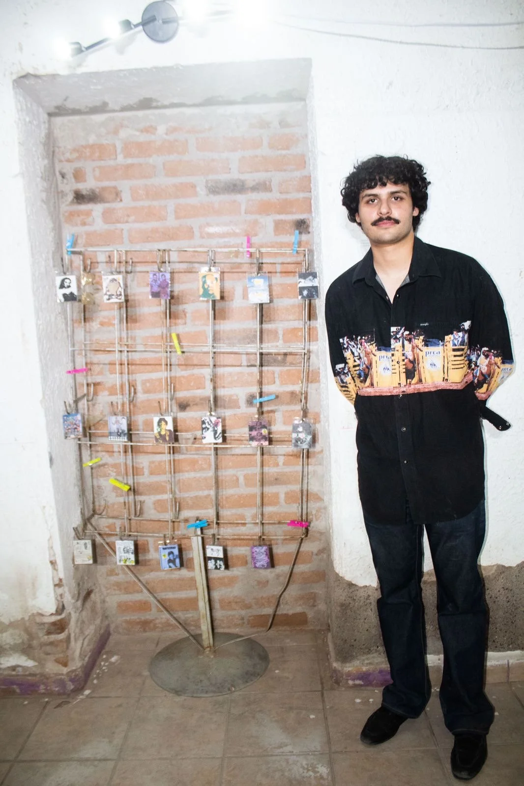 “Miguel Cervantes presenta una estructura de metal llamada me entrego a mi infierno y lo disfruto, la cual está adornada con gafetes que contienen ilustraciones y fotografías intervenidas con dibujos y moscas muertas. Miguel habla poéticamente y hace referencia a los círculos del infierno y sus propias imperfecciones, que provienen de la naturaleza humana.”